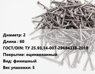Гвоздь 2х60 ГОСТ: ТУ 25.93.14-007-29684338-2018 оцинкованный финишный 5