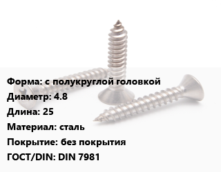 Саморез с полукруглой головкой D=4.8 L=25 сталь без покрытия ГОСТ: DIN 7981, шт цена от 2.79 ₽ / кг, где купить, условия доставки в Донецке и Донецкой области