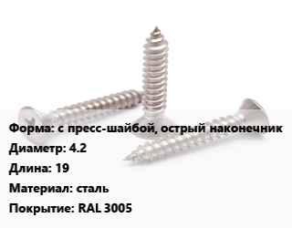 Саморез с пресс-шайбой, острый наконечник D=4.2 L=19 сталь RAL 3005, шт, для металла цена По запросу где купить, условия доставки в Донецке и Донецкой области
