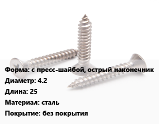 Саморез с пресс-шайбой, острый наконечник D=4.2 L=25 сталь без покрытия, кг цена от 310.14 ₽ / кг, где купить, условия доставки в Донецке и Донецкой области