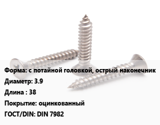 Саморез с потайной головкой, острый наконечник D=3.9 L=38 оцинкованный ГОСТ: DIN 7982
