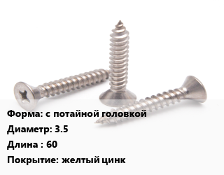 Саморез с потайной головкой D=3.5 L=60 желтый цинк, упаковка 4500 шт цена от 3 799 ₽ / кг, где купить, условия доставки в Донецке и Донецкой области