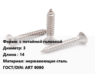 Саморез с потайной головкой D=3 L=14 нержавеющая сталь ГОСТ: ART 9090, упаковка 6000 шт цена от 3 555 ₽ / кг, где купить, условия доставки в Донецке и Донецкой области