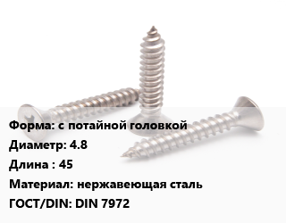 Саморез с потайной головкой D=4.8 L=45 нержавеющая сталь ГОСТ: DIN 7972