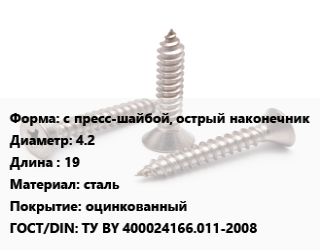 Саморез с пресс-шайбой, острый наконечник D=4.2 L=19 сталь оцинкованный ГОСТ: ТУ BY 400024166.011-2008, упаковка 1000 шт, РМЗ цена от 398.14 ₽ / кг, где купить, условия доставки в Донецке и Донецкой области