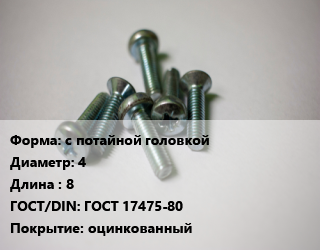 Винт с потайной головкой 4х8 ГОСТ 17475-80 оцинкованный, упаковка 1000 шт,упаковка 5 кг, кг цена от 253.34 ₽ / кг, где купить, условия доставки в Донецке и Донецкой области