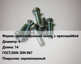 Винт крестообразный шлиц, с прессшайбой 6х14 DIN 967 оцинкованный