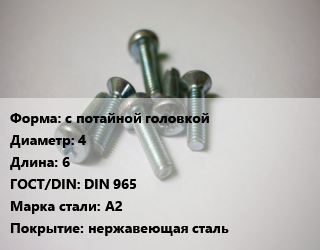 Винт с потайной головкой 4х6 DIN 965 Сталь: А2 нержавеющая сталь, цена за шт, кг цена от 3.15 ₽ / кг, где купить, условия доставки в Донецке и Донецкой области