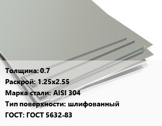 Лист нержавеющий 0.7 1.25х2.55 Сталь: AISI 304 Тип:шлифованный ГОСТ 5632-83