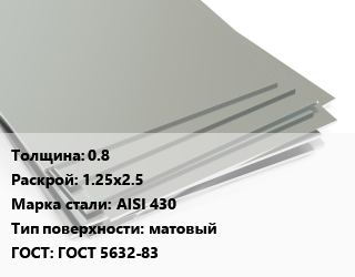 Лист нержавеющий 0.8 1.25х2.5 Сталь: AISI 430 Тип:матовый ГОСТ 5632-83, шт, х/к цена от 4 090 ₽ / т, где купить, условия доставки в Донецке и Донецкой области