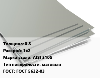 Лист нержавеющий 0.8 1х2 Сталь: AISI 310S Тип:матовый ГОСТ 5632-83, х/к цена от 735 283 ₽ / т, где купить, условия доставки в Донецке и Донецкой области