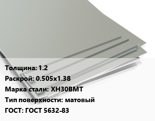 Лист нержавеющий 1.2 0.505х1.38 Сталь: ХН30ВМТ Тип:матовый ГОСТ 5632-83