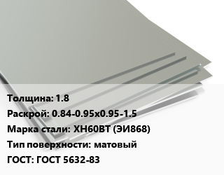 Лист нержавеющий 1.8 0.84-0.95х0.95-1.5 Сталь: ХН60ВТ (ЭИ868) Тип:матовый ГОСТ 5632-83