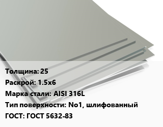 Лист нержавеющий 25 1.5х6 Сталь: AISI 316L Тип:No1, шлифованный ГОСТ 5632-83
