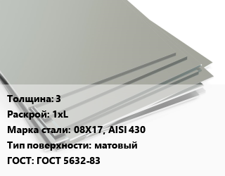 Лист нержавеющий 3 1хL Сталь: 08Х17, AISI 430 Тип:матовый ГОСТ 5632-83, х/к цена от 158 746 ₽ / т, где купить, условия доставки в Донецке и Донецкой области