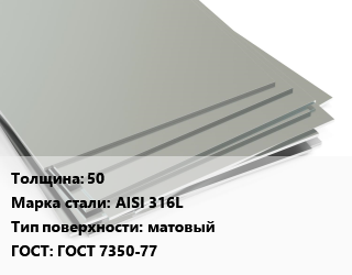 Лист нержавеющий 50 Сталь: AISI 316L Тип:матовый ГОСТ 7350-77, г/к, по запросу цена от 1 401 880 ₽ / т, где купить, условия доставки в Донецке и Донецкой области